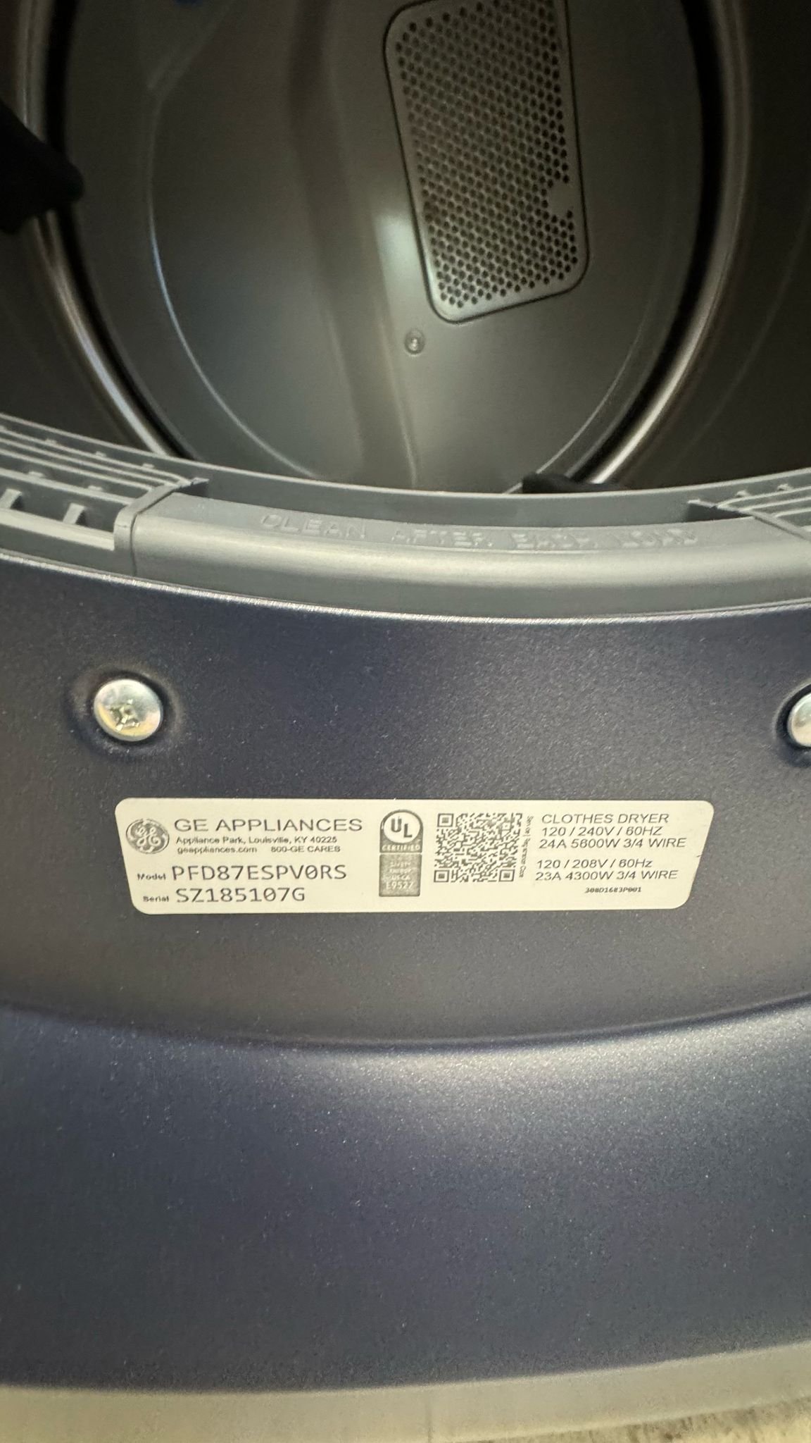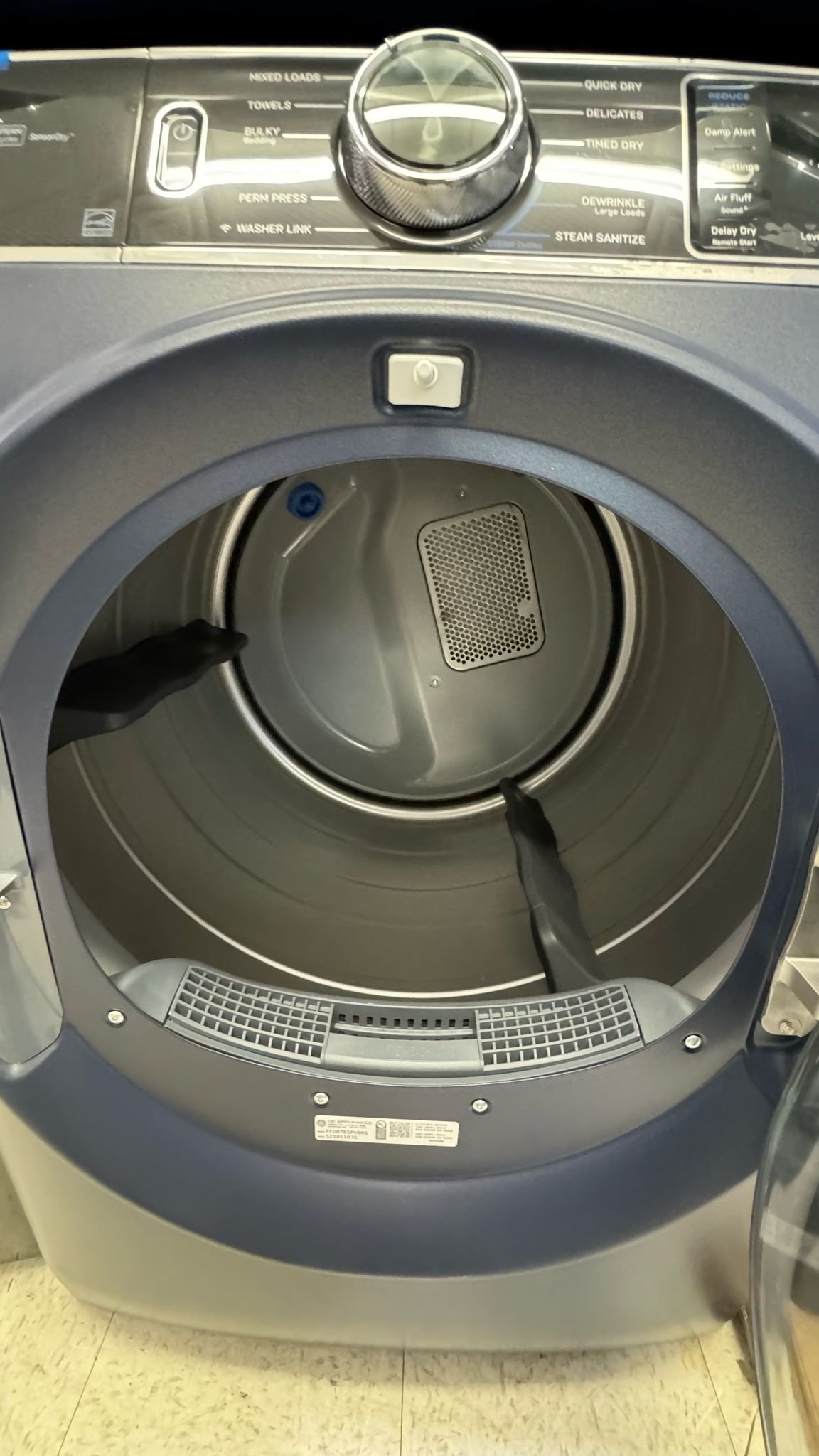 The GE Profile PFD87ESPV0RS is a 7.8 cu ft ultra-large–capacity smart electric dryer built for high-efficiency laundry performance. It features steam-enabled dewrinkling, sanitize-cycle capability, built-in WiFi for monitoring via smartphone, and flexible venting and door orientation — ideal both for busy homes and appliance-store offerings.